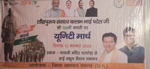 रायगढ़/ जिले के देवगढ़ ग्राम पंचायत में मंगलवार को एकता और अखंडता के प्रतीक सरदार वल्लभभाई पटेल की 150वीं जयंती के उपलक्ष्य में आयोजित होने जा रहे “यूनिटी मार्च” की तैयारियाँ पूरी कर ली गई हैं। आयोजन को लेकर प्रशासनिक और राजनीतिक स्तर पर जबरदस्त उत्साह देखा जा रहा है।