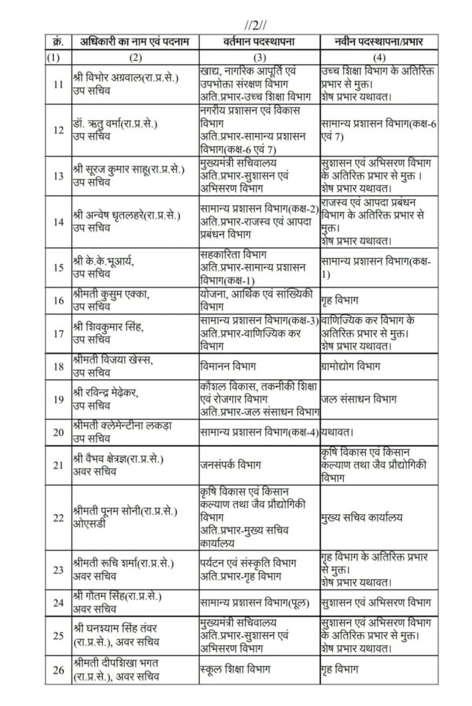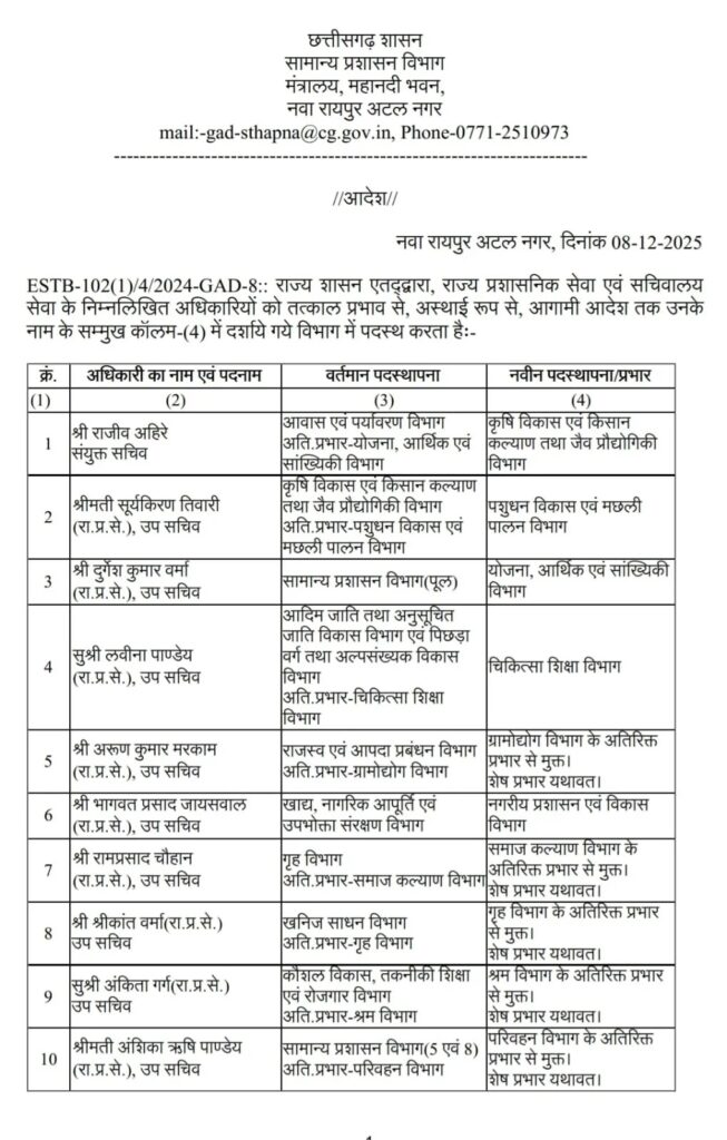 सामान्य प्रशासन विभाग (GAD) द्वारा जारी आदेश में विभिन्न जिलों, विभागों और उपखंड क्षेत्रों में पदस्थ अधिकारियों को नई जिम्मेदारियां सौंपी गई हैं।