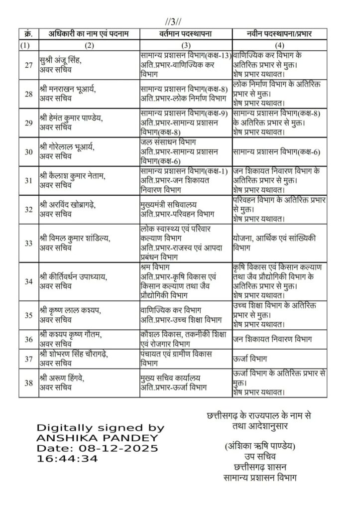 CG SAS Transfer: छत्तीसगढ़ में सरकार ने सोमवार, 8 दिसंबर को बड़े स्तर पर बदलाव करते हुए राज्य प्रशासनिक सेवा (RAS) के 38 अफसरों के तबादला आदेश जारी किए गए।