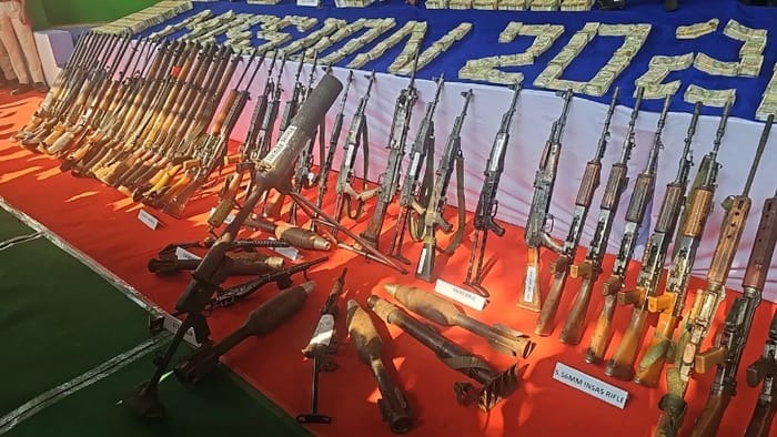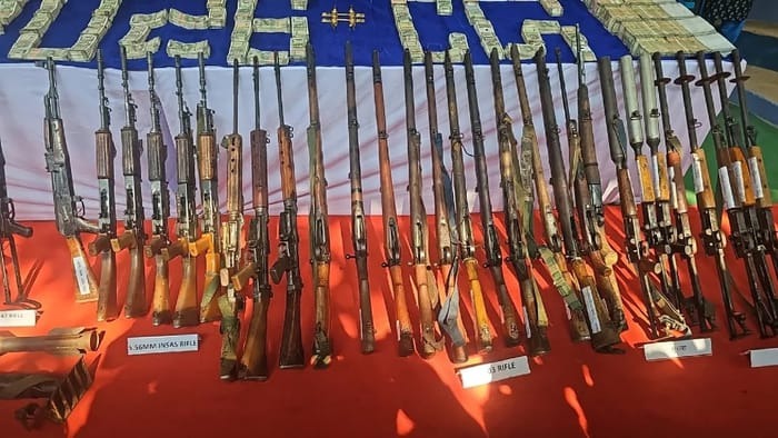 इनके पास से सुरक्षा बलों ने कुल 101 हथियार बरामद किए हैं, जिनमें AK-47 राइफल 6, इंसास राइफल 11, कार्बाइन 5, 303 LMG 20,303 राइफल 25, 12 बोर राइफल 11, 315 बोर राइफल 13 सहित अन्य हथियार बरामद किए गए हैं।