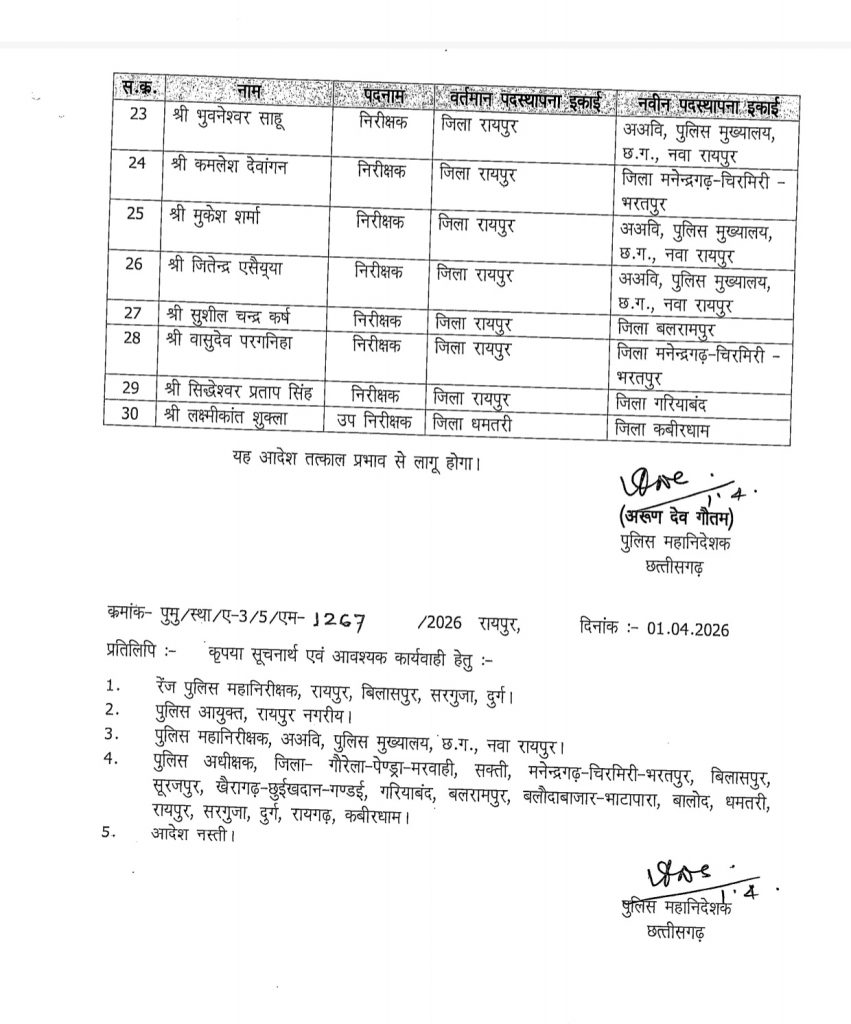 इनमें 29 निरीक्षक और 1 उप निरीक्षक शामिल हैं। जारी सूची के अनुसार, सभी अधिकारीयों को नई पदस्थापना के लिए निर्देशित किया गया है। बताया जा रहा है कि, यह तबादला आदेश प्रशासनिक आवश्यकता और कार्य व्यवस्था को सुदृढ़ करने के उद्देश्य से जारी किया गया है। आदेश जारी होते ही संबंधित अधिकारियों को तत्काल प्रभाव से नई जगह पर कार्यभार ग्रहण करने के निर्देश दिए गए हैं।