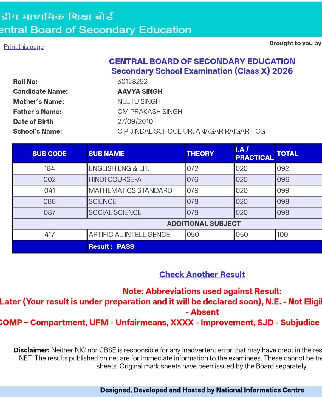 आव्या ने हर विषय में उत्कृष्ट अंक अर्जित कर अपनी प्रतिभा का लोहा मनवाया। उन्होंने अंग्रेजी में 92, हिंदी में 96, गणित में 99, विज्ञान में 98 और सामाजिक विज्ञान में 98 अंक हासिल किए। खास बात यह रही कि अतिरिक्त विषय आर्टिफिशियल इंटेलिजेंस में उन्होंने शत-प्रतिशत 100 अंक प्राप्त कर एक नई मिसाल पेश की।
