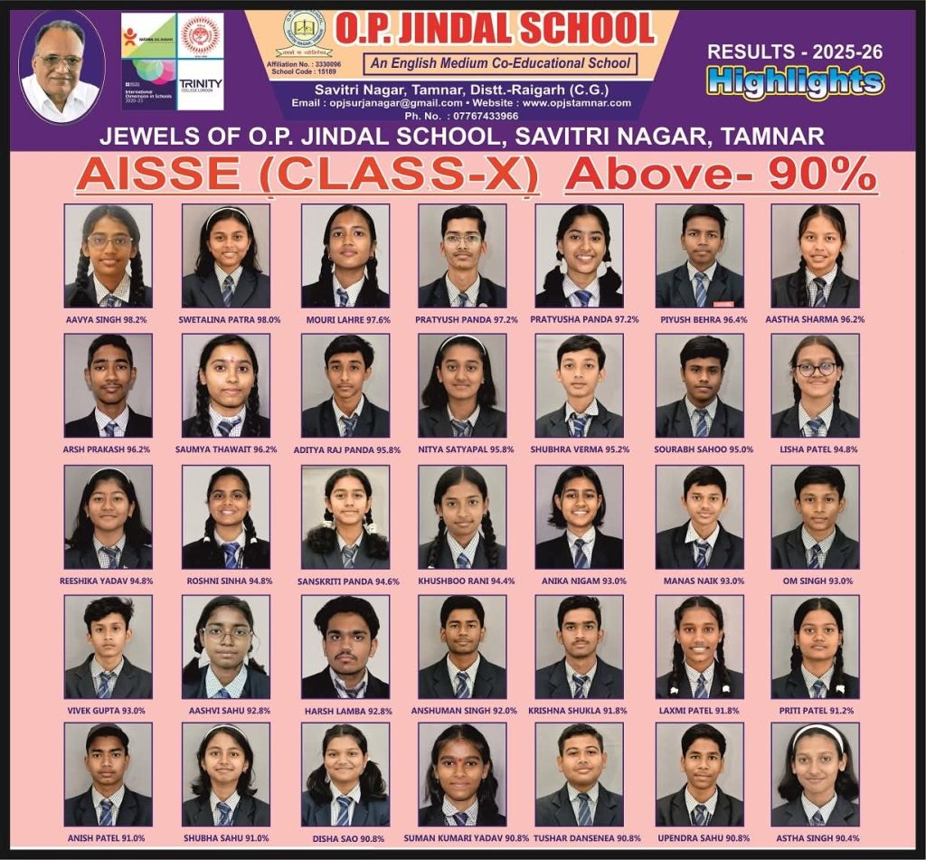 रायगढ़। केंद्रीय माध्यमिक शिक्षा बोर्ड (CBSE) की 10वीं परीक्षा 2026 के घोषित परिणामों में ओपी जिंदल स्कूल, उर्जानगर की होनहार छात्रा आव्या सिंह ने शानदार प्रदर्शन करते हुए न सिर्फ अपने परिवार बल्कि पूरे जिले का नाम रोशन कर दिया है।